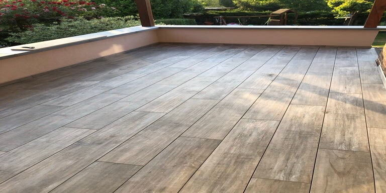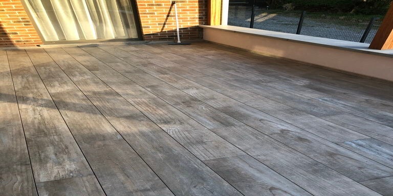 Pose d'un tout nouveau carrelage imitation bois sur une belle terrasse.