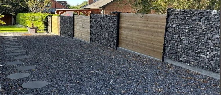 Création d'un parking en pavés kandla accompagnée d'une clôture mélangeant harmonieusement gabions et bois avec un passage latéral en graviers.